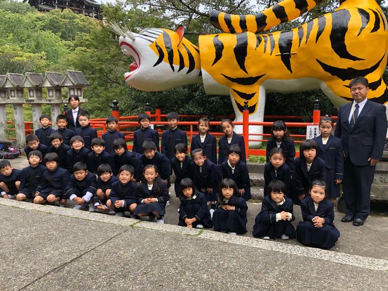 その毘沙門天が現れたのが寅の年、寅の日、寅の刻であったため、寅を守り神としてまつっているんですよ。 大虎の前でクラス写真を撮りました。