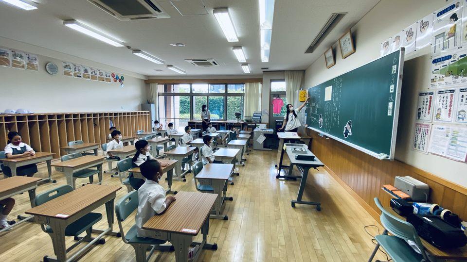 6年生は、ビデオ会議アプリで英語の授業です。おうちにいる友だちともやり取りをしながら進めます。