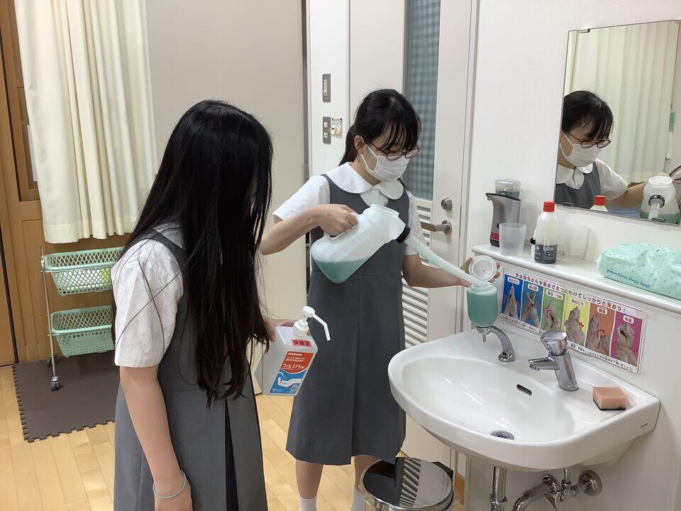 保健委員会は、シャボン石けんやアルコール消毒液の補充をしています。