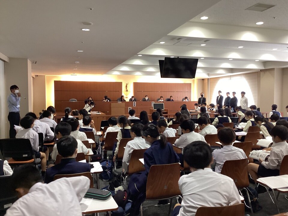 2週間後の東京学習旅行の事前学習として、法廷教室で模擬裁判を体験してきました。裁判官や検察官、弁護人などの役割を自分たちで分担し、まるでドラマの一場面を見るようでした。