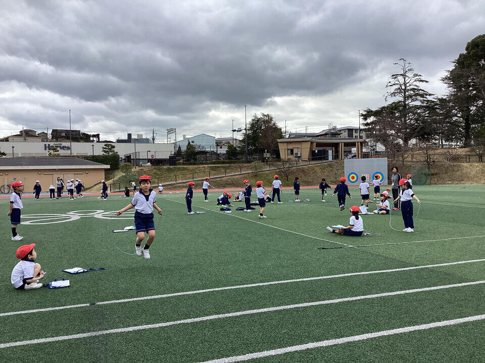 体育の授業中に耐寒駆け足訓練をしたあと、各自でなわとびチャレンジをしています。