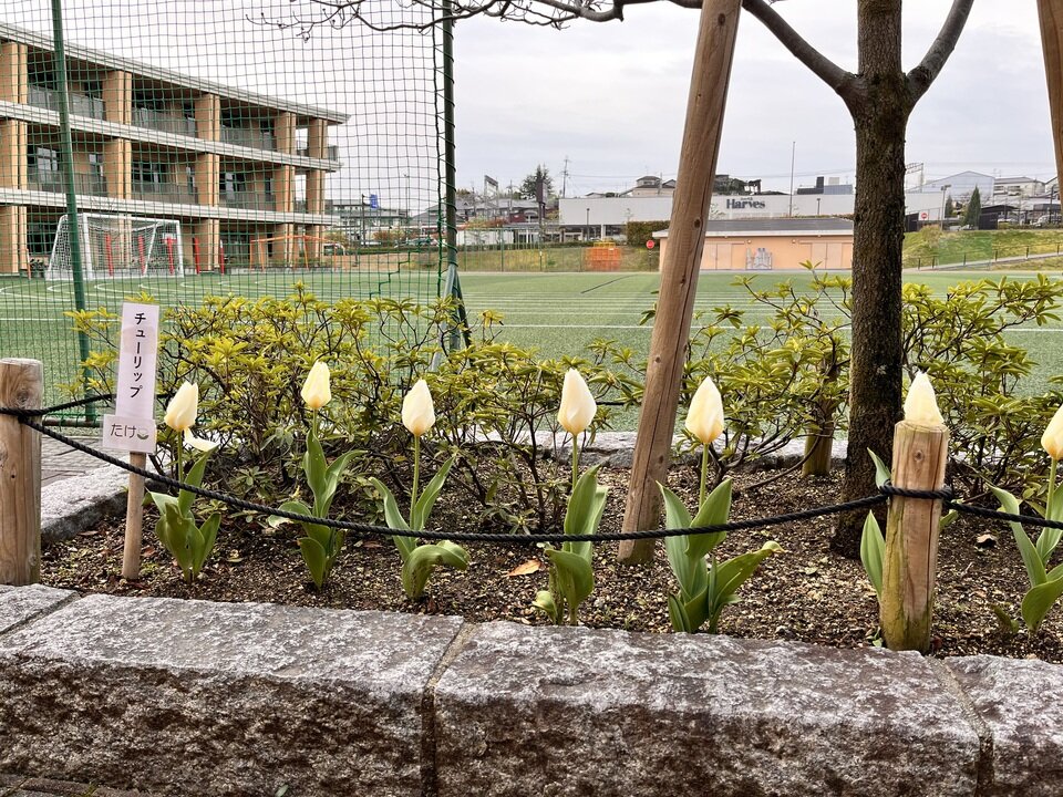 チューリップが整列して歌を歌っているみたいです。松組の植えたチューリップは恥ずかしがり屋が多いのか、まだ歌の練習中。きっと来週の入学式には素敵な歌声を響かせてくれることでしょう!