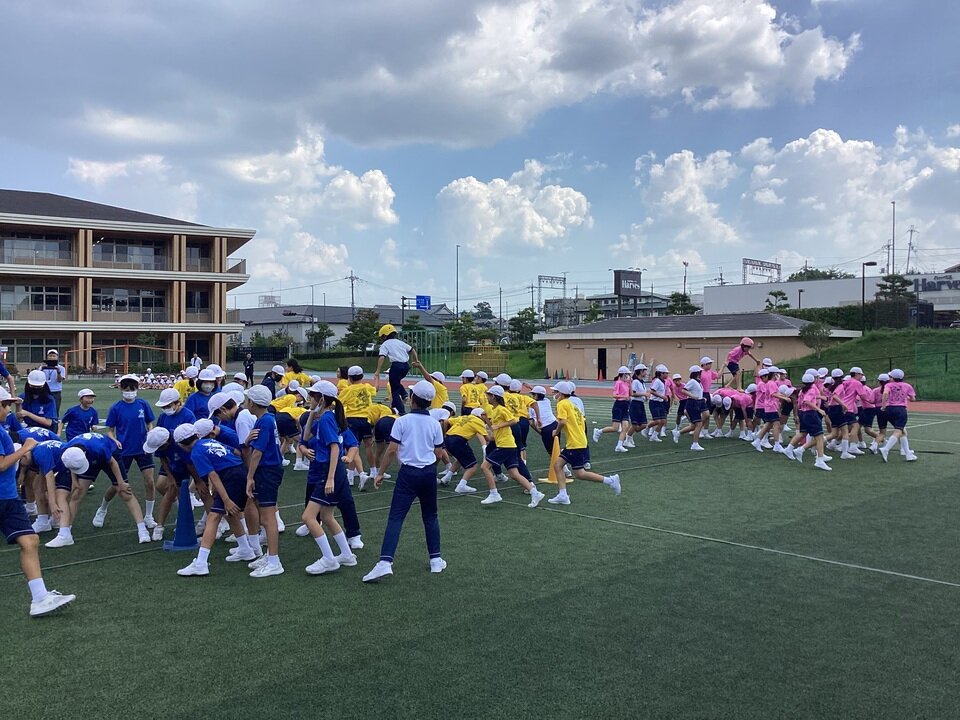 最後の運動会に向けて6年生が団体競技「背渡り」の練習をしていました。お互いに励まし合い、勝利に向かって頑張る姿勢はさすが高学年。クラスTシャツが青い空、緑色の人工芝に映えました。どうすれば少しでも早くゴールできるか、という話し合い活動を自分たちでする姿も立派でした。