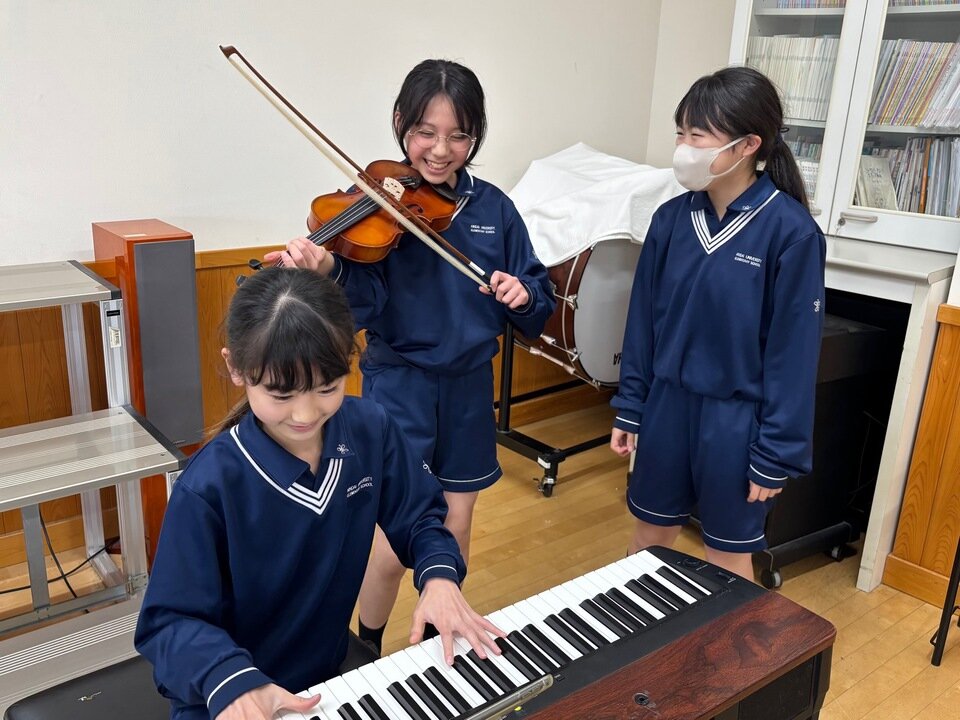 休み時間に音楽室をのぞいてみると、いろいろな楽器の音と笑い声が聴こえてきます。音楽委員の人が発表のために自主練習をしていたり、音楽の好きな人が集まっていろんな楽器を鳴らしていたり...。