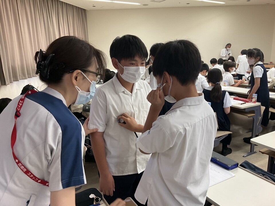 次に,看護師さんに教えてもらいながら,聴診器や血圧計などの体験。血中の酸素濃度を測る機械など,珍しい体験もできて,6年生のお友達は興味津々で体験をしていたよ。