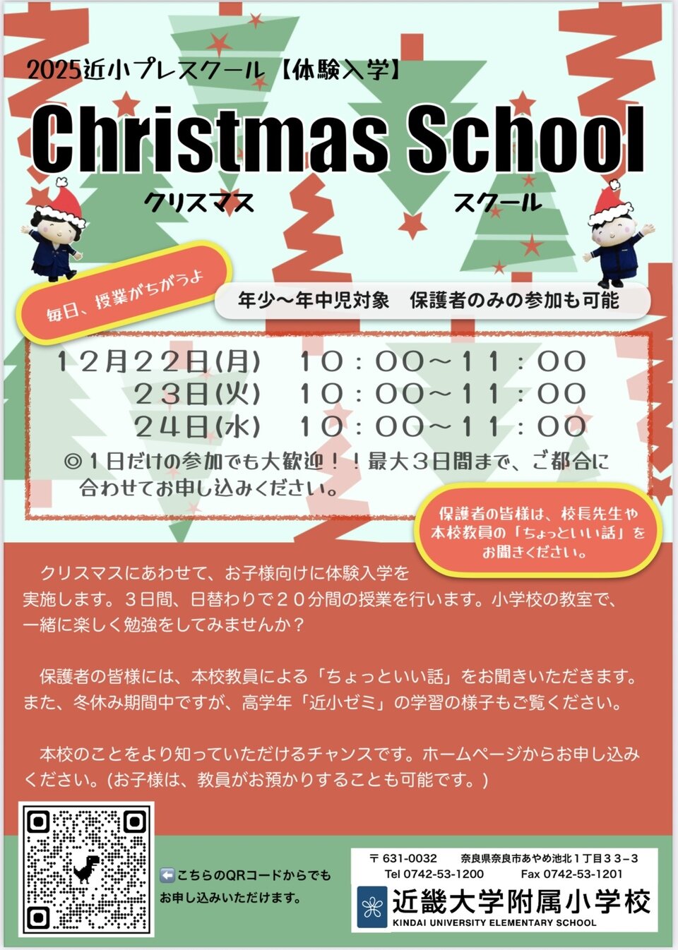 HOME › お知らせ › 体験授業「近小クリスマススクール3days」を今年も実施します。 体験授業「近小クリスマススクール3days」を今年も実施します。 2025.11.18 | 入試情報 年中・年少児を対象に、20分2コマの体験授業を行います。子供たちが体験授業に参加している間には、保護者の方向けに、本校の教員による「ちょっといい話」をお聞きいただきます。今年度は、教務部長、教育研究部長、進路指導部長が、この日しか聞けない「ちょっといい話」を致します。 寒い中ではありますが、ぜひ近小にお越しください。 ●詳しくはこちらから ●申し込みはこちらから カテゴリー 学校生活 学校行事 入試情報 その他 最新記事 体験授業「近小クリスマススクール3days」を今年も実施します。 創立記念日(11月5日)に伴う休校のお知らせ 【重要】卒業生のGmailアドレスの削除について 近小焼展&学校説明会のお知らせ 【教育関係者対象】学校公開 Open Day2025を開催します! バックナンバー 2025 11 10 09 07 06 05 04 03 02 01 2024 12 11 10 09 2020 06 05 2019 04 2016 05