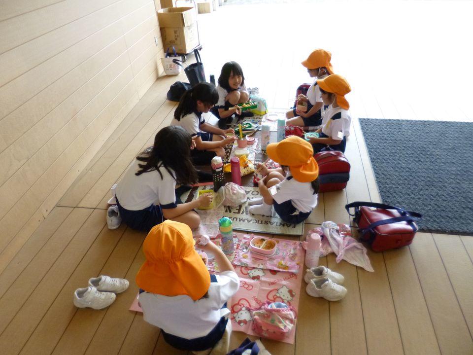 年長2,3人と5年生一人でペアになり、小学校のピロティでランチタイム♪