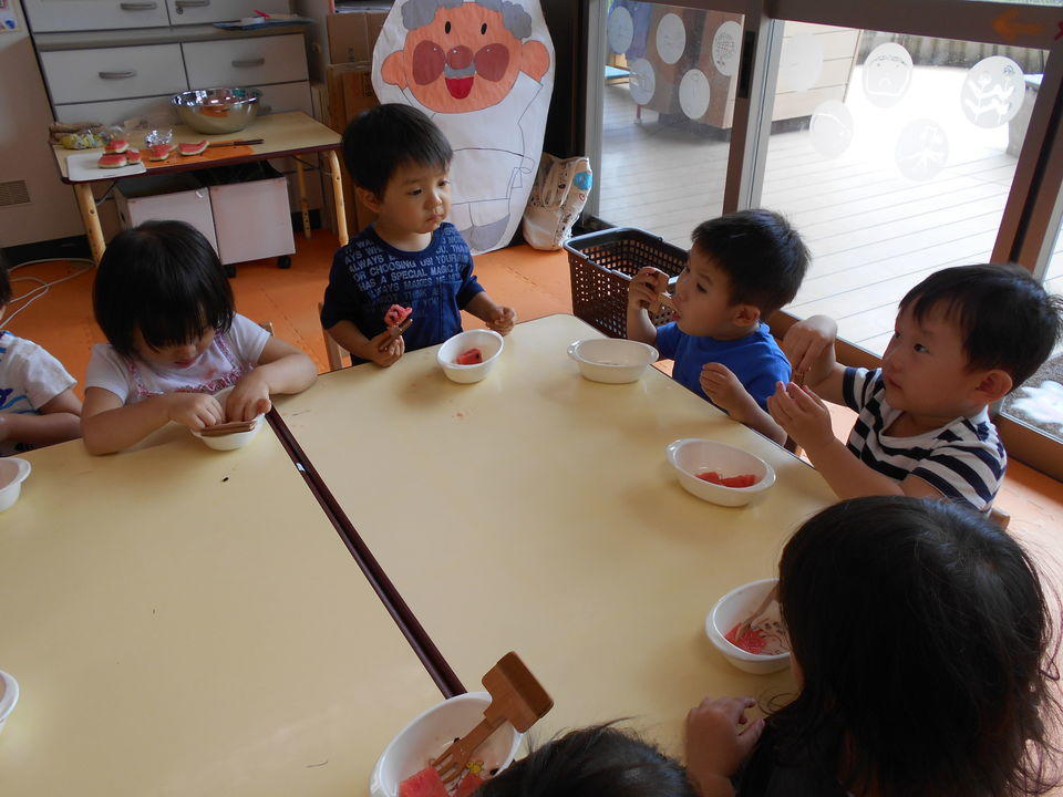 今日は、小学校のアリーナに音楽会の練習を見に行きました。小学校の階段の昇り降りもできました。音楽会では、お兄さんお姉さんに頑張ってもらいたいですね。アリーナから戻って、七夕さまを作りました。スイカもフォークを使って食べました。おかわりもいっぱいしたね。冷たくて美味しかったね~!