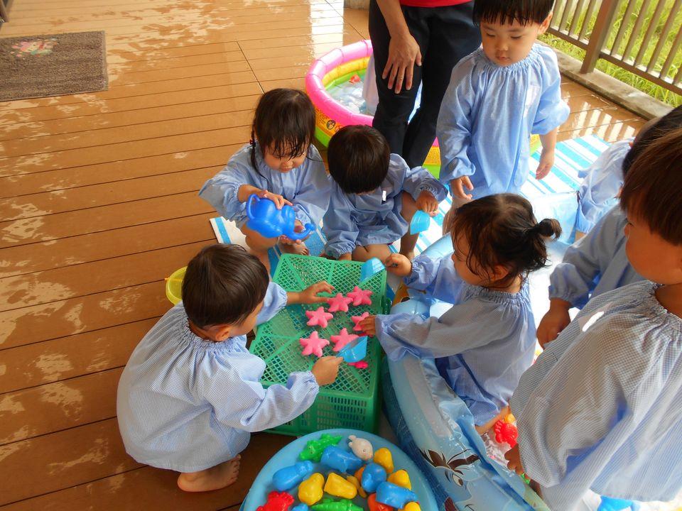 今日は年長組のプールを見たよ。その後、みんなでプールに入ったよ。