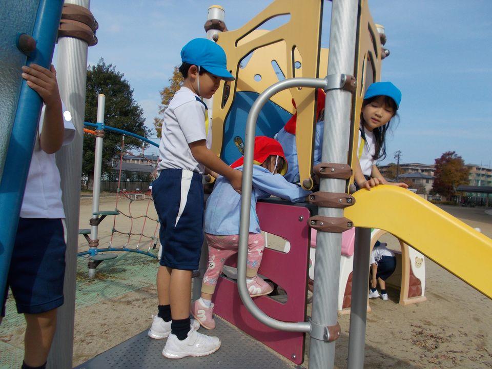 すべり台のステップを登らせてくれたり、三輪車に乗せてくれたり、砂場でスコップの使い方を教えてくれました。さすが年長さん、自分の好きなところに行ってしまうつぼみ組さんに上手についてきてくれました。