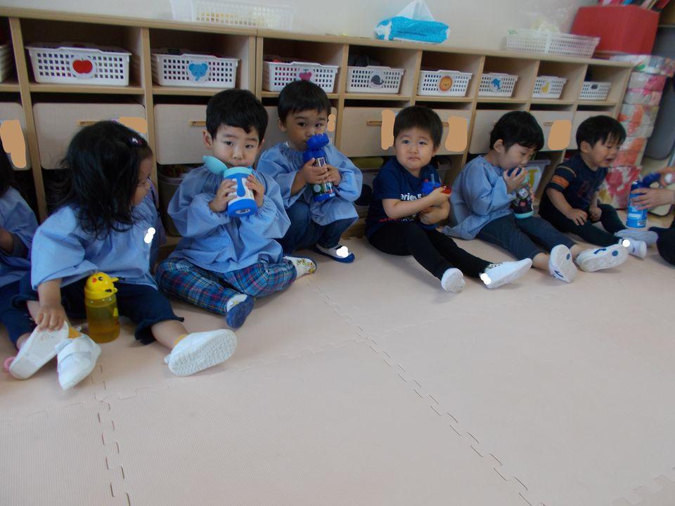 いっぱい遊んだ後はお茶を飲んでひと休み。自分のマークも覚えたかな~?