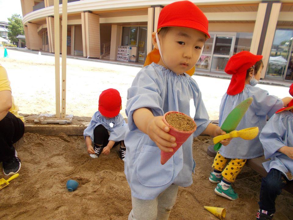 お砂場でままごとをしました。スコップ上手に使えました♪見て見て~できた!いっぱい入れたら嬉しくて見せてくれました。すごい達成感です。