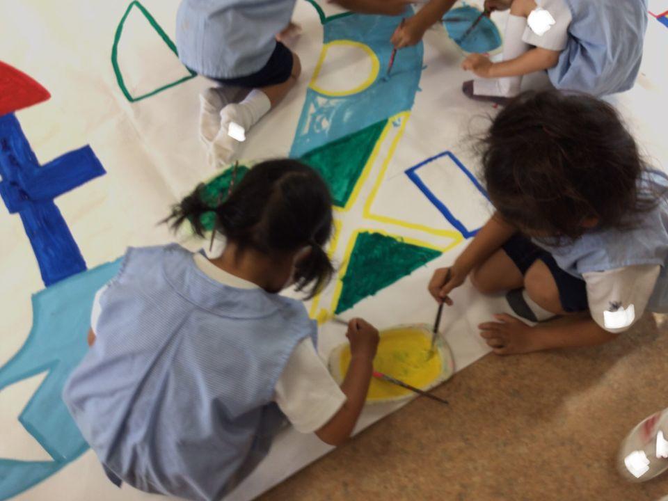年長も好きな色を選び、音楽会の壁面に取り組みました☆全園児で少しずつ作り上げました!!