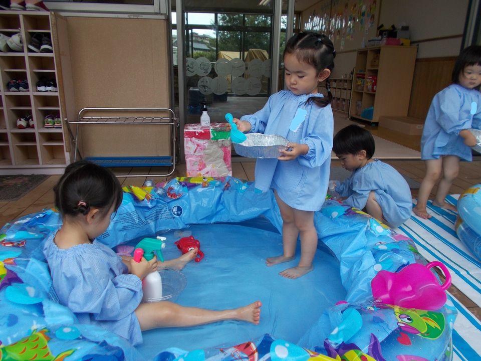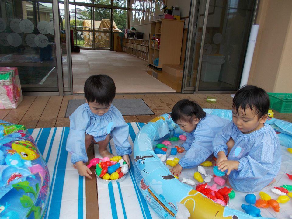 金曜クラスのお友達です♪前期最終日でした。幼稚園を楽しみに来てくれる様になりましたね。遊んでいる表情はとっても笑顔だったり、時に夢中になって真剣だったりいろんなお顔がみられます。最終日にピッタリのプール遊び。「わ~プール!」とみつけて大喜びでした♪魚を作って泳がしてみようと入れてみんなも入って遊びましたよ♪