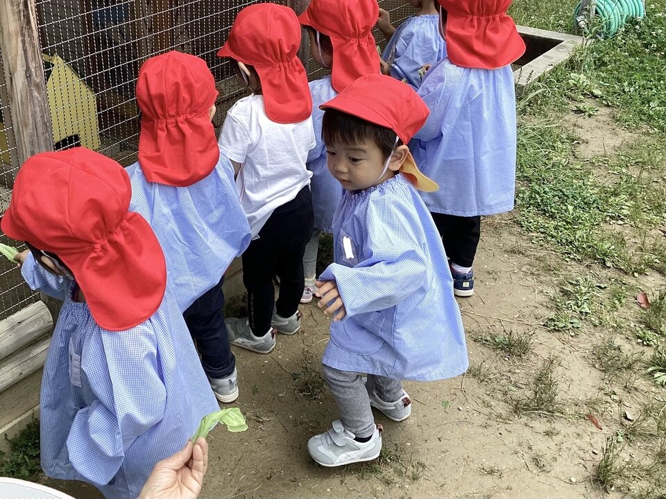 しばらくすると晴れてきたので、ウサギさんにもごあいさつ。キャベツ食べてね。「先生、キャベツください!」「はい、どうぞ!」