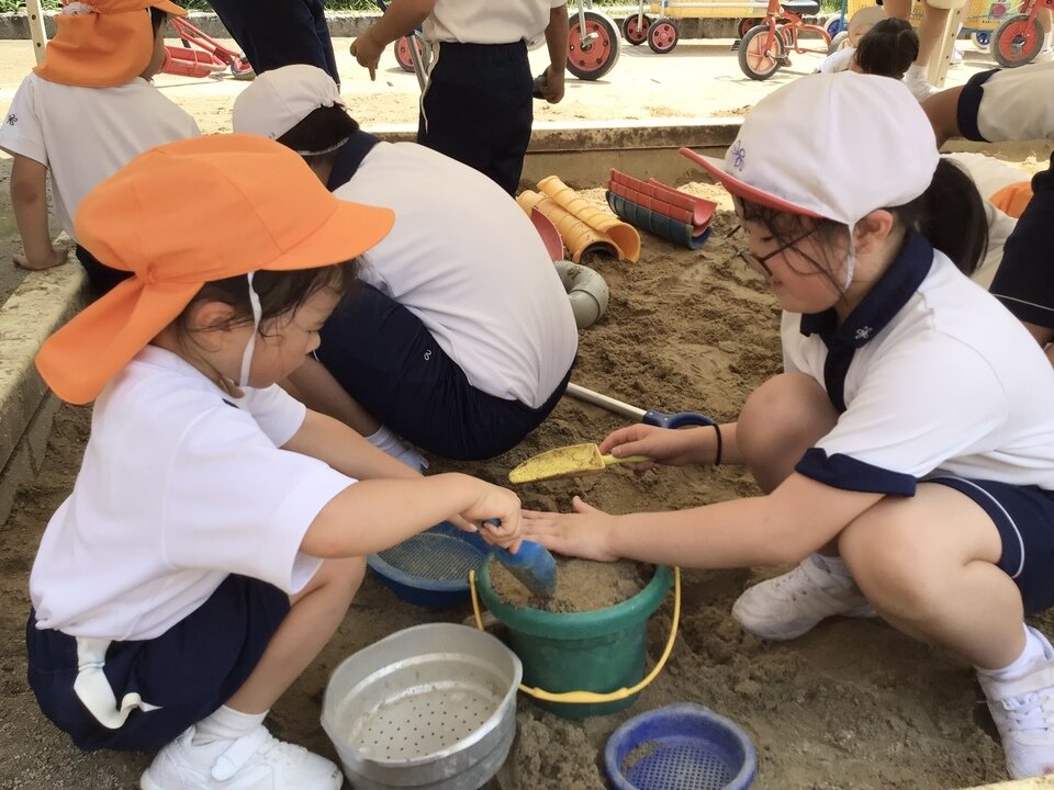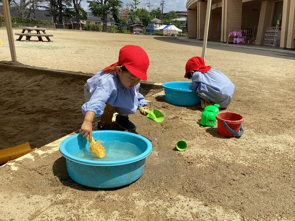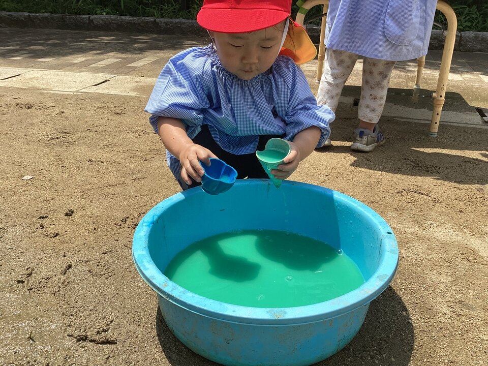 水遊びが大好きなつぼみ組さんです。今日はジュース屋さんごっこが始まりました。
