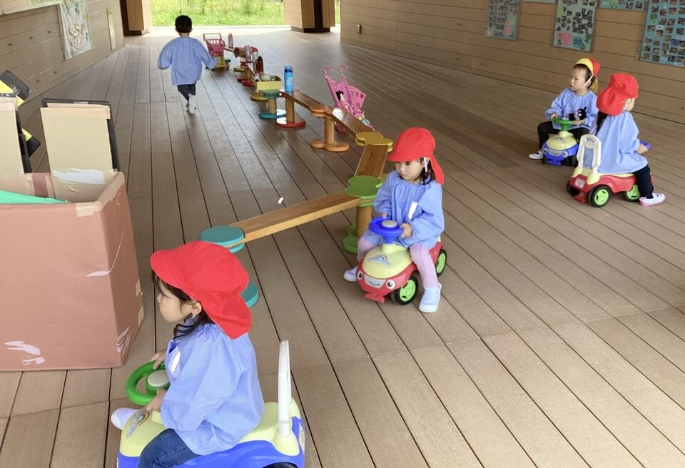 順番に並んで走ったり、仲良く声をかけながら運転したり、とても楽しそうです。車に乗せてあげる人形を「はい、どうぞ!」と渡したり、友だち同士の関わりも増えてきました。