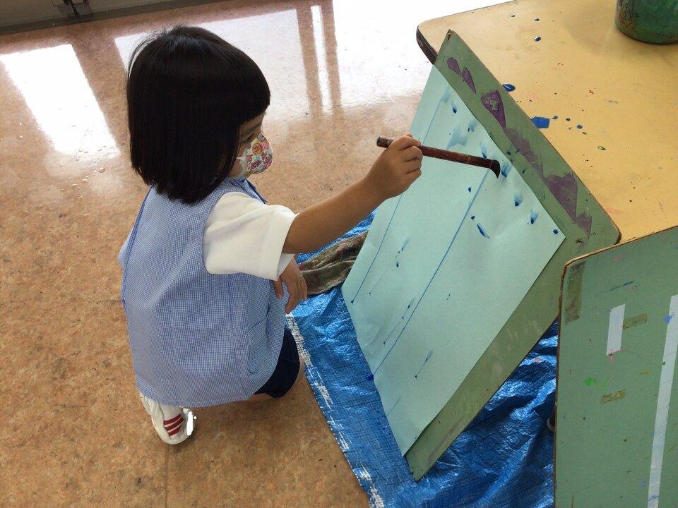 雨をイメージして、画用紙を立てて絵の具をたらしていきました。