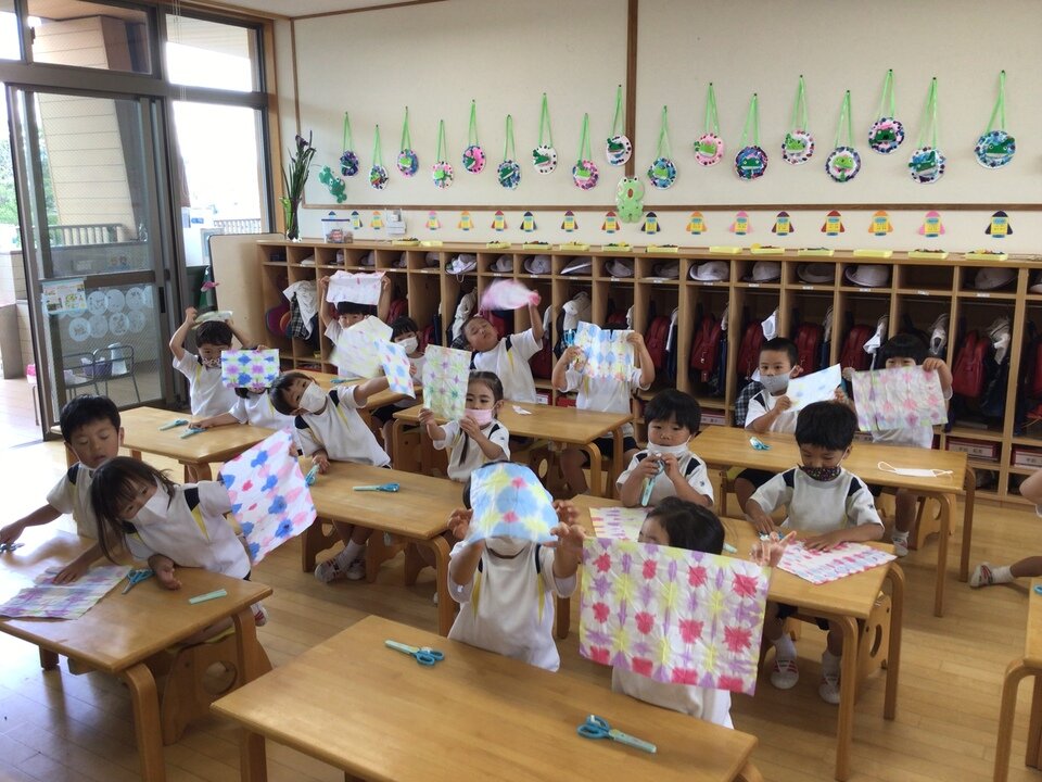 半紙をじゃばら折りにして、絵の具につけて染め紙をしました。