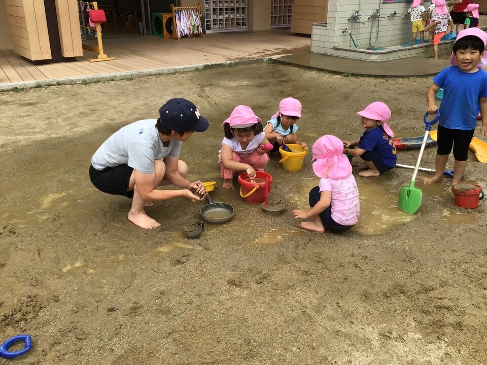 楽しみにしていたどろんこあそびです。容器と土と水があればいきいきとあそぶ子どもたちです。