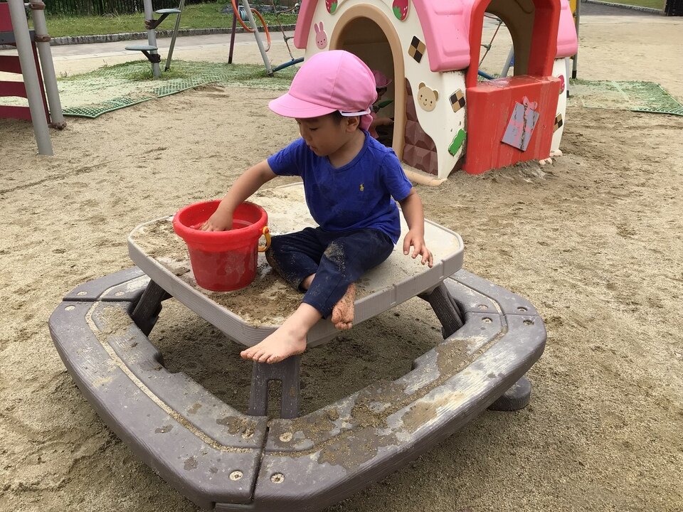 今日は梅雨の晴れ間で雨が降らなかったので、さっそくお庭に出ました。たらいの中に魔法の粉を入れて、さあ! あわあわごっこのスタートです!