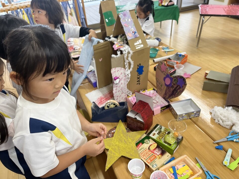 劇遊びに向けて制作も楽しみました。いろいろな場面を考え、思い思いに友だちと協力して作っています。