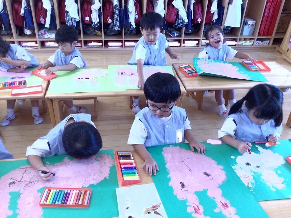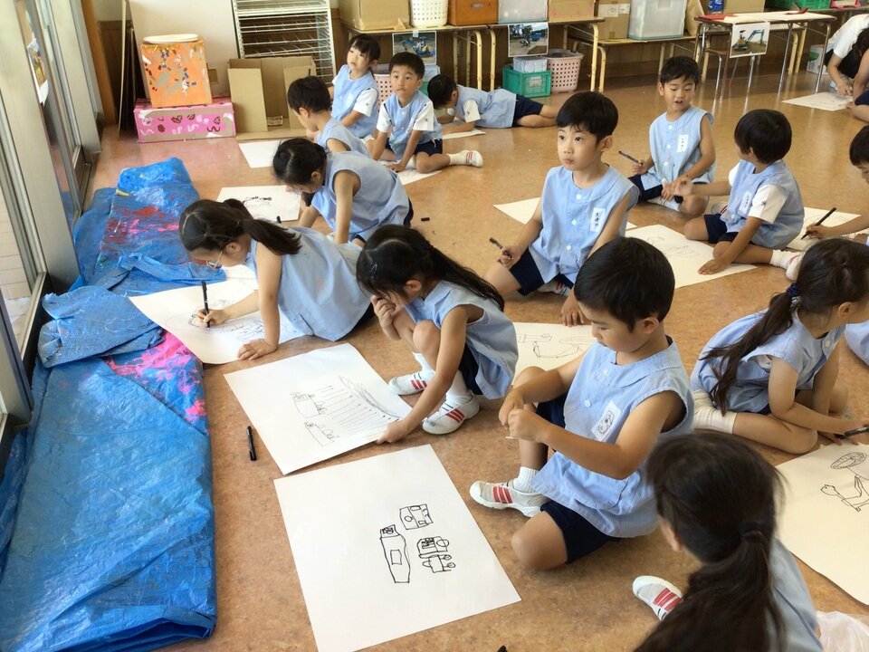 今回の絵画は、先日園庭に工事車両が来ていて興味もすごいので描いてみました。細かい部分を見ている子もいて楽しそうでした。
