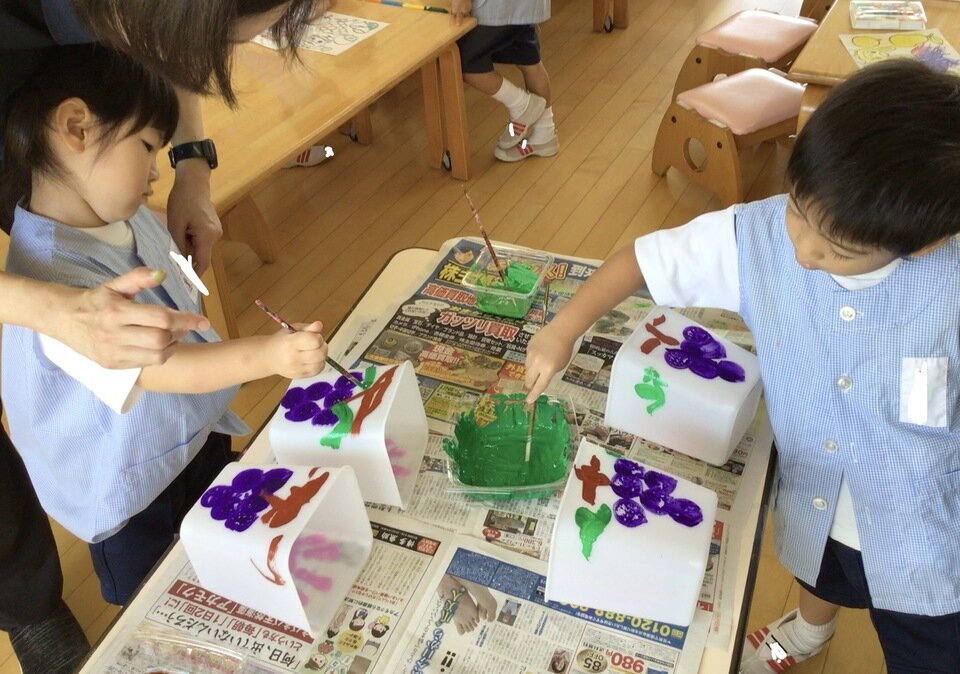 おじいちゃん、おばあちゃんへのプレゼント作りも絵の具で手形やスタンプにしました。喜んでもらえると嬉しいなぁ〜